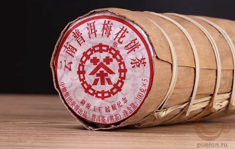 «Пуэр с цветами сливы» из провинции Юньнань изготавливается из тщательно отобранного, выдержанного на большой высоте высококачественного ферментированного сырья чайного региона Мэнхай. В его производстве используется ретро-рецепт. Для изготовления используется особо отобранное сырье, с большим количеством почек. Ферментация умеренная, что дает оригинальную текстуру вкуса. Чайный блин имеет уникальную и красивую форму и изготавливается вручную традиционными методами. Это – скорее «шайба». Толстый блинчик с прямыми боковыми гранями. На одной стороне изображен иероглиф «чай», а на оборотной — узор «цветок сливы». Каждый блинчик-шайба упакован в хлопчатобумажную бумагу. Стопка из пяти «шайб» обернута рулоном крафт-бумаги и бамбуковой скорлупой. Все это перевязано бамбуковыми «нитками». В итоге получается оригинальная ретро-упаковка. Как пишут маркетологи бренда Чжун Ча, это классическое переосмысление, сочетающее в себе наследие прошлого и стремление в будущее.